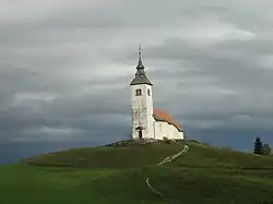 The local church on a hill above the settlement is dedicated to the Holy Cross and was built around 1500. It contains many well-preserved frescos from 1502 that depict the legends of Saint Ulrich, to whom the church was dedicated until 1867, and of Saint Corbinian. Some of the frescos in the nave, dating to around 1530,[5] are believed to be by Jernej of Loka. The hill with the church is a popular destination for short outings by locals.[6]