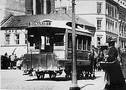 The second class consisted of fourteen units delivered by Skabo between 1887 and 1892. These were delivered in various configurations of open and closed seating and were normally only operated during winter. They had the same dimensions as the Stephenson cars.[1] The final class, built by Falkenried, consisted of fifteen units delivered in 1897. Measuring 6.6 meters (22 ft) in length, they were sufficiently heavy they needed to be hauled by two horses. This was a calculated choice, as they were primarily intended to be used as trailers for the electric trams.[6]