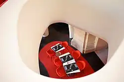 Decq furnished the restaurant in modern style, with bright red upholstery contrasting with the white hull, which curves up to form the handrail on the stairs and around the mezzanine.[10] The red carpet on the stairs extended in islands on the black floor of the ground floor dining area. The private bar, wrapped around a column, was also black.[7] Decq described the dominant red as lighter than "opera red", "between orange and red".[3] The terrace also had red seating, including large benches.[8]