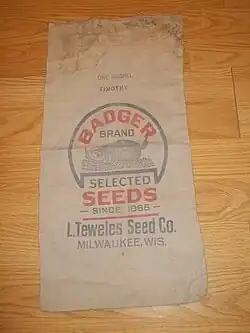 Teweles Seed was known for branding their seeds. Forage seeds were initially sold with a grade of "prime", "choice" or "fancy" until Hugo Teweles, a zoo buff, proposed in the 1920s to brand the seed grades with the Badger brand as the top quality and Buffalo and Elk brands as the two lesser qualities.[2] The firm differentiated itself by selling seed in smaller bags, 60 pounds for alfalfa, clovers, etc. and 45 pounds for timothy-grass, with orchard and brome grass in 50-pound bags, about half the size of the industry's standard packaging.[2] The slogan for the Badger brand in the 1950s was "More PURE-LIVE seed for your money."[6]