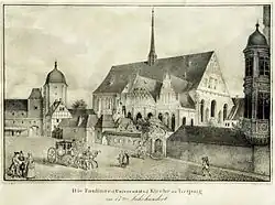University Church, Leipzig, where the cantata was first performed (17th-century lithograph) | |