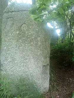 Several of the Lancken-Granitz dolmens remained in use until the early (Nordic) Bronze Age.[18] In dolmen Nr. 1, fragments of a bronze needle and a bronze necklace were found,[9] and in dolmen Nr. 3, a bronze needle with one end rolled-up, a bronze finger ring, and part of a bronze necklace.[11] In the early Bronze Age, dolmen Nr. 1 was abandoned and filled with rocks and dirt, had its entrance closed and was covered by an artificial hill.[9] Likewise, dolmen Nr. 6 including its stone circle was covered by a hill, 2 metres (6.6 ft) in height, and it was discovered only in 1969 that it was not a tumulus, but a dolmen[7] - it had even been protected as a Bronze Age tumulus before.[2]