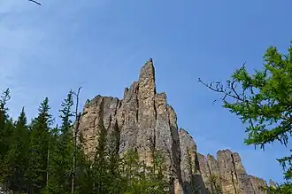 The Lena Pillars (Russian: Ле́нские столбы́, romanized: Lenskiye Stolby; Yakut: Өлүөнэ туруук хайалара, Ölüöne Turūk Khayalara) are a natural rock formation along the banks of the Lena River in far eastern Siberia. The pillars are 150–300 metres (490–980 ft) high, and were formed in some of the Cambrian period sea-basins. The highest density of pillars is reached between the villages of Petrovskoye and Tit-Ary. The Lena Pillars Nature Park was inscribed on the World Heritage List in 2012.[1]