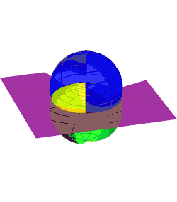 The three dimensional lens space is often defined to be a solid ball with the following identification: first mark p equally spaced points on the equator of the solid ball, denote them to , then on the boundary of the ball, draw geodesic lines connecting the points to the north and south pole. Now identify spherical triangles by identifying the north pole to the south pole and the points with and with . The resulting space is homeomorphic to the lens space .