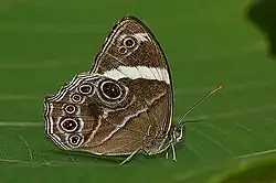 It is about 50–55 mm in expanse, with the upper surface of wings predominantly brown in colour. The forewing has a sub-apical white band and pale spot on the apex. The underside of the hindwing has a large ocellus or and a series of spots along the margin. It is found in bamboo forests.