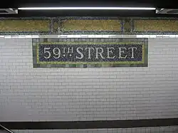 The station used to have all green tile which has been covered up except for one "59th Street" sign near the south end of the northbound platform. There are whimsical stylized mosaics of coffee cups and slippers in varied colors at random spacing near the stairways to the Broadway and IRT local trains.[123]