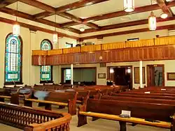 The church is a brick-veneered frame building that was built in 1926. The identity of its architect is not known, but the design suggests the work of Charles I. Barber. The entrance to the building is framed by columns with Doric capitals. Interior furnishings include oak pews, stained glass windows, a coffered ceiling over the sanctuary, and an altar balustrade.[2]
