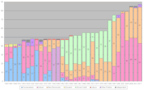 | Social Credit | 47 (1986) | 75% (1956) | 954,516 (1986) | 49.76% (1983) | 11 | |