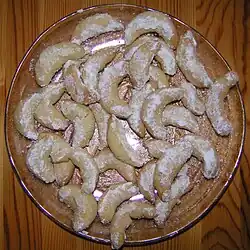 A pastry made from marzipan with almond, powdered sugar, rosewater, flour and egg. It is a traditional cookie usually baked for Christmas Day and is widely available in chocolate shops around Frankfurt.[4] |