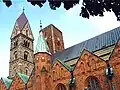 most of the walls of brick, but a lot of stone tracery; was a cathedral 1561 to 1801