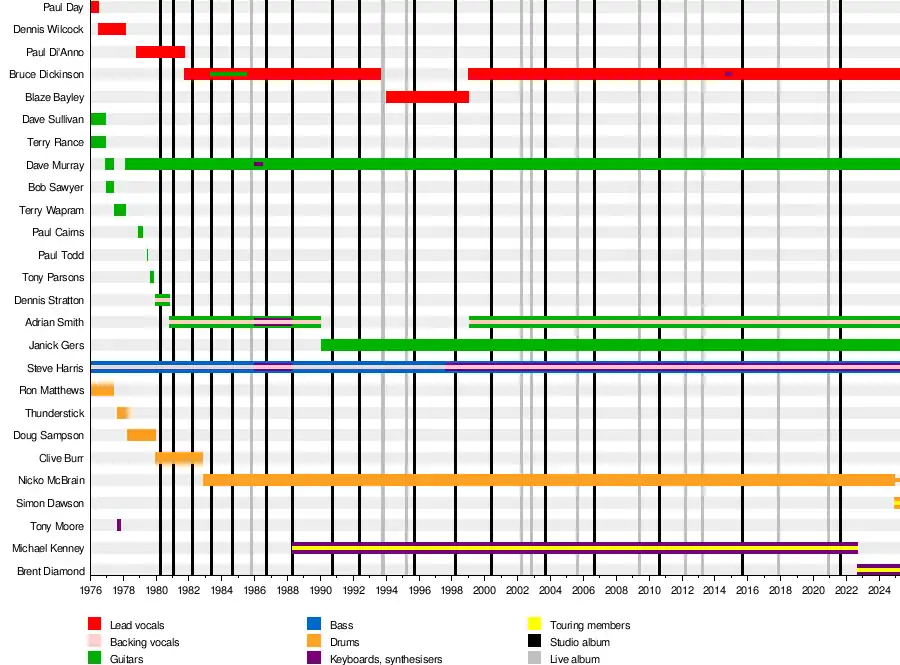 Iron Maiden are an English heavy metal band formed in 1975 by bassist Steve Harris. After several lineup changes prior to their recording career, they settled on Harris, vocalist Paul Di'Anno, guitarist Dave Murray and drummer Doug Sampson. The band currently consists of Harris and Murray with guitarist Adrian Smith (who first joined in 1980), vocalist Bruce Dickinson (who first joined in 1981), drummer Nicko McBrain (since 1982) studio only since 2024 and replaced live by Simon Dawson (British Lion) and guitarist Janick Gers (since 1990).