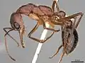 | Myrmecia flammicollis | — | Brown[32] | 1953 | M. flammicollis is only known from workers collected in Far North Queensland. Workers are medium in size, measuring about 13 millimetres (0.51 in), with a generally black body. The prothorax is orange-red, and the mandibles, antennal scapes and legs are reddish brown. The palpi, and parts of the antennae, mandibles and tarsi are yellow. This species is similar to Myrmecia petiolata, but is more slender and differs in colouration.[32] |