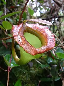 The official IUCN conservation status of each species is taken from the latest edition of the IUCN Red List.[1] Unofficial assessments based on the IUCN criteria are also included, but are presented in italics. Unless otherwise noted, taxonomic determinations and all other information are sourced from Stewart McPherson's two-volume Pitcher Plants of the Old World, published in 2009.[2] Where recent literature provides an altitudinal distribution that falls outside the range given in Pitcher Plants of the Old World, the discrepancy is noted.