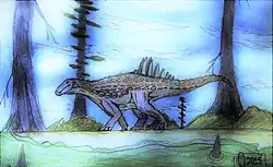 The earliest potential record of dinosaurs in North America comes from rare, unidentified (possibly theropod) footprints in the Middle-Late Triassic Pekin Formation of North Carolina.[1] However, the most reliable early record of North American dinosaurs comes from fragmentary saurischian fossils unearthed from the Upper Triassic Dockum Group of Texas.[2] Later in the Triassic period, dinosaurs left more recognizable remains, and could be identified as specific genera. Examples of later Triassic North American dinosaur genera include Coelophysis, Chindesaurus, Gojirasaurus, and Tawa. Fossils of Tawa-like dinosaurs have also been found in South America, which has important indications about paleogeography. During the Early Jurassic Period, dinosaurs such as Dilophosaurus, Anchisaurus, Coelophysis (formerly known as Megapnosaurus), and the early thyreophoran Scutellosaurus lived in North America. The latter is believed to have been the ancestor of all stegosaurs and ankylosaurs. The Middle Jurassic is the only poorly represented time period in North America, although several Middle Jurassic localities are known from Mexico. Footprints, eggshells, teeth, and fragments of bone representing theropods, sauropods, and ornithopods have been found, but none of them are diagnostic to the genus level.