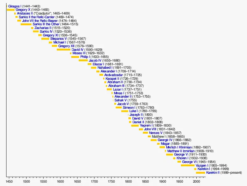 Karekin I | Գարեգին Ա Սարգիսյան (Քեսաբցի) | (1994–1999) | Previously served as the Catholicos of Cilicia from 1983 to 1994 as Karekin II |