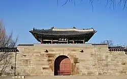 The east gate.[39] It was named in 1426.[40][41][30] It was repaired in 1428.[40] After being destroyed in 1592, it was rebuilt in 1865. It was originally only meant for use by civil servants.[39][42] However, during the colonial period and around the time of the construction of the Government-General of Chōsen Building, it became used as the main gate of the palace.[42] It is mostly identical in form to Yeongchumun.[39] |