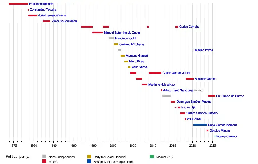 Braima CamaráGeraldo MartinsNuno Gomes NabiamArtur SilvaUmaro Sissoco EmbalóBaciro DjáDomingos Simões PereiraRui Duarte de BarrosAdiato Djaló NandignaMartinho Ndafa KabiAristides GomesCarlos Gomes JúniorArtur SanháMário PiresAlamara NhasséFaustino ImbaliCaetano N'TchamaFrancisco FadulManuel Saturnino da CostaCarlos CorreiaVictor Saúde MariaJoão Bernardo VieiraConstantino TeixeiraFrancisco Mendes