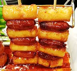 Dak-kkochi | South Korea | Grilled chicken skewers. The meat is first cooked and cut into narrow slices, then it is coated with barbecue-flavor spices. Mayonnaise and mustard may also be used as toppings.[85][86] |