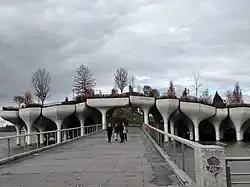 The park's four corners are designed with different topologies.[15] There are three lawns, as well as a "secret garden" planted exclusively with white flora.[14] One of the lawns, the Main Lawn, is in the center of the park.[1] Alongside the landscapes, the park contains scenic observation areas as well as plazas and performance spaces.[4][17] There are overlooks at the northwest, southwest, and southeast corners of the park.[1][15] Walkways lead up to the highest portions of Little Island, in a layout similar to the southern portion of Governors Island.[14] The park also contains objects that visitors could interact with, such as chimes, boulders, and spinning discs. Heatherwick Studio intended for both solo visitors and groups to play with these objects.[18]