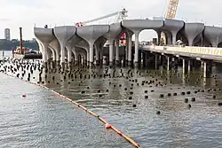 Each pot has four to six lightweight concrete sections, referred to as "petals", which are designed to reduce the load on the pilings.[9][10] The precast concrete is also meant to be resistant to erosion and corrosion.[10] The concrete pots were manufactured by the Fort Miller Company at their factory in Easton in Upstate New York.[9][11] The Fort Miller Company hired a partner to create foam molds for the pieces of the pots using a laser cutter, then cleared out a 600-foot-long building for these foam pieces. Thirty-nine types of molds were fabricated. According to the company's president, "A full one-third of our annual production capacity was displaced by this project."[10]