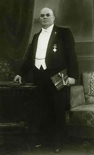 But now, the most important historians and museologists of Lithuania like Almantas Šlivinskas, Leopoldas Rozga or Leonas Peleckis-Kaktavičius, consider him one of the most important writers and publishers of Lithuania. He produced more than two million books and performed more than 280 plays in 1898–1938.[1] From 1888 to 1891 he worked in Šiauliai (Lithuania) as a journalist and writer. In 1891, he settled in Riga (Latvia), where he started working as judge and administrator of the railway company. In 1904, he opened his own printing house (AB Lietuvos Knygynas) and his own bookstore in Riga (Latvia). In 1909, he founded the newspaper Rygos naujienos which maintained its activities until 1915.[2] He also collaborated with other newspapers and journalists like his friend Antanas Smetona (writer, journalist and the first president of the Republic of Lithuania). It should be mentioned that Antanas Smetona wrote about Liudvikas Jakavičius in his memories, written in Cleveland, Ohio, US, in 1960.[3] In 1910, Jakavičius founded The Society of Lithuanian Theatre of Riga. In 1914, he financed the construction of the Lithuanian Theater of Riga. That same year he founded the Lithuanian–Latvian Savings Bank. His bank grew up rapidly, but it was expropriated in 1915 by the State Bank of the Russian Empire, as a result of the beginning of the First World War. In 1916, all his business was paralyzed and confiscated by the outbreak of the First World War and he changed his residence to Saint Petersburg (Russia). He bought 15,000 USD (equivalent to US$350,000 in 2014) in printing equipment and moved the machinery in secret to Saint Petersburg, where he continued with his printing house spreading Lithuanian language.