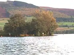 Llangorse Lake is a eutrophic glacial lake with a three-mile (5 km) perimeter covering an area of 139 hectares (340 acres). The lake is one mile (1.6 km) long, is 505 feet (154 m) above sea level and has a maximum depth of 7.75 m (25 ft 5 in).[2][3][4] It occupies a glacially scoured rock basin partly enhanced by morainic debris[5] within the drainage basin of the River Wye but close to that of the River Usk to the south. The Afon Llynfi provides the main input of water into the lake and continues as the lake overflow stream.