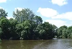 The island sits on a sharp bend in the river. It is densely covered with tall trees and has a narrow channel behind it. In the nineteenth century there was a thatched cottage on the island linked to the bank by a rustic bridge which was a popular place for picknickers.[1] Alice Liddell used to visit the island with Lewis Carroll, who penned Through the Looking-Glass shortly after one of these visits. There is evidence of weirs and flash locks here, at one time owned by Lord Harcourt, which may account for the name of the island.[2]