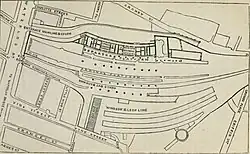 Throughout the 19th century, the L&SWR aimed to extend its main line eastward beyond into the City of London, and was reluctant to construct a dedicated grand terminus at Waterloo.[4] Consequently, the station had none of the usual facilities expected of a terminus until 1853, when a small block was built on the far east side of the station. In 1854, the London Necropolis & National Mausoleum Company opened a private station inside Waterloo that provided services to Brookwood Cemetery.[15] The station was demolished and replaced with a dedicated building in 1902, as part of the reconstruction of Waterloo in the early 20th century.[16]