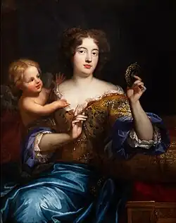 Legitimising the ‘natural’ children of French kings was regular practice,[125] yet devout courtiers and those anxious for their privileges as ‘lawful’ descendants of aristocratic houses scorned the decision.[126] Louis later explained in his Mémoirs that he wanted to provide for his mistress and child in case he died in war. He considered it ‘just’ to grant Marie-Anne ‘the honour of her birth’ and reward La Vallière in a way ‘suited to [his] affection’.[127] Her brother was promoted in the army and her uncle made a bishop.[123][128] It seems that La Vallière was not aware that her lover's actions signalled the end of the relationship. She was pregnant again, but her unborn child (and any later offspring) was not included in the succession of her duchy.[125]
