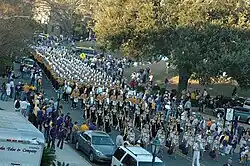 On game days, the band marches from the band hall to Tiger Stadium, stopping by at Victory Hill, located right outside the stadium. Fans lining North Stadium Drive await the arrival of the band.[15] The band stops on the hill and begins to play the opening strains of the "Pregame Salute." Then, while playing the introduction to "Touchdown for LSU," the band starts running in tempo through the streets and down the hill. The band also marches from the stadium to the band hall upon the conclusion of the game, a practice not usually employed by other bands.[10]
