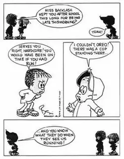 The cartoonist is actually violating what has always been an American taboo, and that is to create non-white characters or even poor white characters who are human, sympathetic and even lovable. Brandon employs his irresistible humor to level the walls of racism. And what better stage setting could he devise than the schools and the kids they're trying to educate.[9]