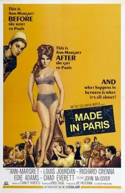 Made in Paris is a 1966 American romantic-comedy film starring Ann-Margret, Louis Jourdan, Richard Crenna, Edie Adams, and Chad Everett. The film was written by Stanley Roberts and directed by Boris Sagal.[2][3]