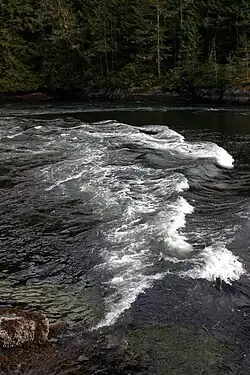 The way to determine the direction of the tidal flow at the narrows is to observe the direction in which the tide is flowing. If the tidal flow is heading toward the Jervis Inlet then the tide is going out (low tide). But if the flow is moving toward Princess Louisa Inlet the tide it is coming in (high tide).[1]