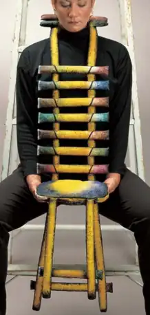 In the 2000s, Schick began experimenting with turning everyday items into wearable art. She designed Yellow Ladderback Chair in 2001 to evoke the "experience of being in a chair". The canvas necklace, creates a symbiosis of the ornamentation with the human wearer.[24] That year, she participated in the group showing Open Links, hosted in Bowling Green, Ohio, by the university's fine arts department, with the aim of broadening attendees' perspectives to the redefinition of what jewelry could be.[25] Two years later, she created Tool Belt and Scarf for Sonia Delaunay inspired by Delaunay's patterned designs. The belt, made of dowels, and the scarf, made of wood blocks, mirror the futuristic motifs of the painter and are surrounded by wooden implements such as paint brushes and pans, a needle, scissors and thread, which Delaunay might have used in her work. When the piece is worn, the tools of the artist's trade float around the wearer's knees.[10]