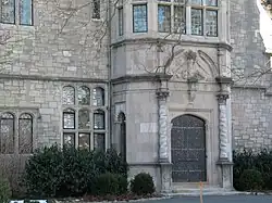 The property's first mansion burned to the ground on March 19, 1918; its replacement, the present Main House (previously referred to as Coe Hall), was constructed between 1918 and 1921 in the Tudor Revival style and faced in Indiana limestone. It was designed by the firm of Walker & Gillette and was completed in 1921. Images from a book of English country houses, especially those of Moyns Park, Athelhampton, and St. Catherine's Court, inspired its architecture. William and Mai Coe's interest in rare species of trees and plant collections made the estate a botanical marvel.