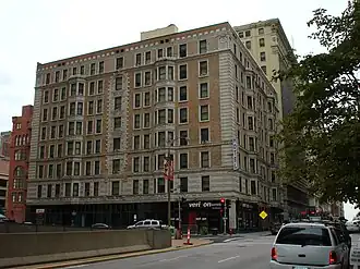 The Maryland Hotel, now known as the Mark Twain Hotel, is a historic hotel in downtown St. Louis, Missouri. The hotel was built in 1907 and designed by St. Louis architect Albert B. Groves. The Classical Revival building uses terra cotta decorations extensively; in particular, the second story is covered entirely in terra cotta, and other decorative terra cotta panels feature fruit and flowers.[2]