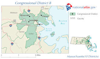 - Map of Massachusetts's 8th Congressional District, via Massachusetts Secretary of the Commonwealth