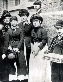 The workers were paid different rates for completing a ten-hour day, depending on the type of work undertaken.[24] The frame-fillers were paid 1 shilling (s) per 100 frames completed; the cutters received 23⁄4 d for three gross of boxes, and the packers got 1s 9d per 100 boxes wrapped up. Those under 14 years-of-age received a weekly wage of about 4 s.[25] Most workers were lucky if they took the full amounts home, as a series of fines were levied by the foremen, with the money deducted directly from wages. The fines included 3 d for having dirty feet—many of the workers were bare-footed as shoes were too expensive—or having an untidy workbench or talking; 5 d was deducted for being late; and a shilling for having a burnt match on the workbench. The women and girls involved in boxing up the matches had to pay the boys who brought them the frames from the drying ovens and had to supply their own glue and brushes. One girl who dropped a tray of matches was fined 6 d.[26][27]