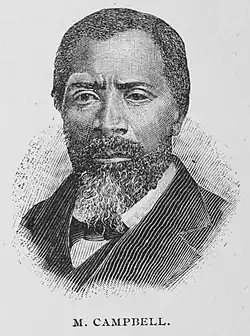 In 1863, during the American Civil War (1861 to 1865), Campbell purchased his freedom for $233 and hired his wife.[3] Campbell and his wife worked for government clerks in Nicholasville, Kentucky, near Camp Nelson,[6] with half of his wife's earnings going to her slaveholder.[3] Campbell was a very active leader in the church and organized three other churches at Mt. Pleasant, Otter Creek, Mt. Nebo,[1] New Liberty Baptist in Bobtown (in 1866), Kirksville,[6] and Goodloe Chapel.[3] He helped establish the Baptist Church South Elkhorn District and the Mt. Pleasant District Association, and was involved in the 1870 meeting of the General Association of Baptists in Kentucky which led to the formation of Simmons College of Kentucky. In 1892, he was awarded a doctor of divinity degree by the school. He was active in Republican politics and attended several local Republican Conventions.[3] He also kept meticulous track of his activities as a minister. when he died it was reported that during his career he ordained 125 ministers and deacons, baptized 5,000, traveled 33,900 miles, and raised thousands of dollars.[7] In 1895 he wrote an autobiography.
