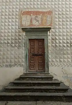 A 16th-century front door engraved with the figure of the Annunciation to Mary allows entering the Baptistery. The 7th-century plunge pool located inside the baptistery is the most ancient in Valtellina. Frescoes from the 15th century represent the Trinity, Saint Barbara, Saint Stephen and John the Baptist. [8]