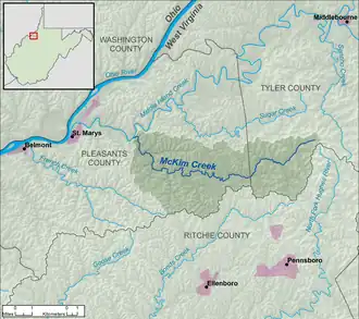 McKim Creek is a tributary of Middle Island Creek, 20.4 miles (32.8 km) long,[3] in northwestern West Virginia in the United States. Via Middle Island Creek and the Ohio River, it is part of the watershed of the Mississippi River, draining an area of 37.3 square miles (97 km2)[4] in a rural region on the unglaciated portion of the Allegheny Plateau.