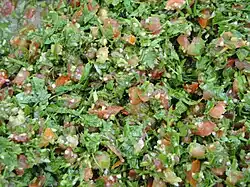 Levantine cuisine is the cooking of the Levant (Mediterranean coast, east of Egypt). Among the most distinctive foods of this cuisine are traditional small meze dishes such as tabbouleh, hummus, and baba ghanoush.[59][60] Tabbouleh is a dish of bulgur cracked wheat with tomatoes, parsley, mint, and onion, dressed with olive oil and lemon juice.[61][62] Baba ghanoush, sometimes called "poor man's caviar", is a puree of aubergine with olive oil, often mixed with chopped onion, tomato, cumin, garlic, lemon juice, and parsley. The dish is popular across the whole of the Eastern Mediterranean and North Africa.[63]