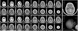 | CT scan, showing a tumorous mass in the posterior fossa, giving rise to obstructive hydrocephalus, in a six-year-old girl | |