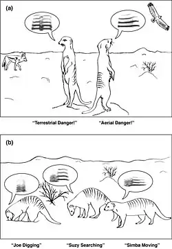 - ^ Manser, Marta; Fletcher, Lindsay (2004). "Vocalize to localize: A test on functionally referential alarm calls". Interaction Studies. 5 (3): 327–344. doi:10.1075/is.5.3.02man.