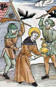 After some years at Reichenau, and the dependent priory at Benken, St. Gallen near Lake Zurich, around 829 he embraced an eremitical life and established his hermitage on the slopes of Etzel Pass, taking with him a wonder-working statue of the Virgin Mary which he had been given by the Hildegard (abbess of Fraumünster) of Zurich. Because so many people sought him out, in 835 he retreated to a hermitage in the forest on the site of today's monastery in Einsiedeln. Inspired by the Desert Fathers, Meinrad practiced a strict asceticism. Gifts presented to him he passed on to the poor.[2] He was killed in 861 by two robbers who wanted the treasures which they believed pilgrims had left at the shrine. Meinrad is known as the Martyr of Hospitality.
