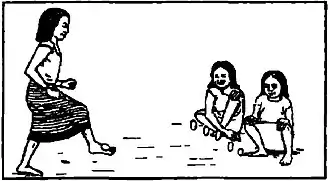 Seeds of Kaangkhin (ꯀꯥꯡꯈꯤꯟ) or Kaangkhil (ꯀꯥꯡꯈꯤꯜ), a plant of a genus (Entada) of the mimoseae family,[5] are traditionally used as playthings. In the eponymous game, a player places a Kaangkhin seed on the dorsal side of their foot and lifts that leg while jumping with the other leg to reach a destination. The player must not let the seed fall off her foot. At the destination, there are other Kaangkhin seeds already placed, and the goal is to hit those seeds by using their foot to throw her own Kaangkhin seed, without using their hands.[2]