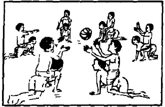 Players use a slippery, oiled coconut (ꯌꯨꯕꯤ, yubi[15]) as a ball in the Meitei traditional game of Yubi Laakpi (ꯌꯨꯕꯤ ꯂꯥꯛꯄꯤ), literally meaning "coconut snatching".[16] The coconut is hard to hold because it is smooth and oily, making the game more difficult. Players try to pass, carry it, but it often slips or bounces in unexpected ways, making the game more fun and challenging. This is common in rural areas or during festivals.[2]