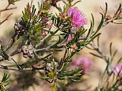 The flowers are arranged in heads or short spikes on the ends of branches which continue to grow after flowering, or sometimes in the upper leaf axils. The heads are up to 25 mm (1 in) in diameter and contain between 2 and 8 groups of flowers in threes. The petals are 1.7–3 mm (0.07–0.1 in) long and fall off soon after the flowers open. The stamens, which give the flower it colour are shades of pink, purple or mauve with yellow tips and are arranged in five bundles around the flower, each bundle containing 6 to 10 stamens. Flowering is in spring and early summer and is followed by fruit which are woody capsules 2.5–3.5 mm (0.098–0.14 in) long.[2][3]