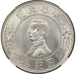 The military government of Sichuan province produced memento dollars locally from 1927 to 1930. These were based on the Nationalist government's coinage, although vary slightly in quality. Some varieties of these coins feature errors in the English typography, such as the misspelling of "REPUBLIC" as "REPUBIIC" or an upside-down T in "BIRTH".[7] The Manchurian provinces, the last to produce the Yuan Shikai dollar, ceased production in 1929, and the Memento dollar was briefly the sole legally-produced silver dollar in China; however, provincially-issued Yuan Shikai dollars continued to circulate alongside the new national currency.[8]