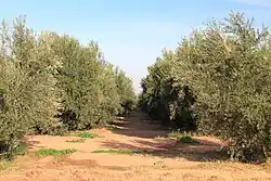 Royal Moroccan gardens like the Menara were designed for a primarily productive agricultural purpose, with its recreational purpose coming second.[14] While there have not been many comprehensive archeological investigations of these gardens, historical texts provide some information about what was planted here and in other gardens like the Agdal. Throughout their history they were planted similar types of trees and crops, mostly fruit and olive trees.[14] Today the orchard still consists mostly of olive trees and to a lesser extent fruit trees and cypress trees. The trees are planted in a regular 10-meter grid.[5]